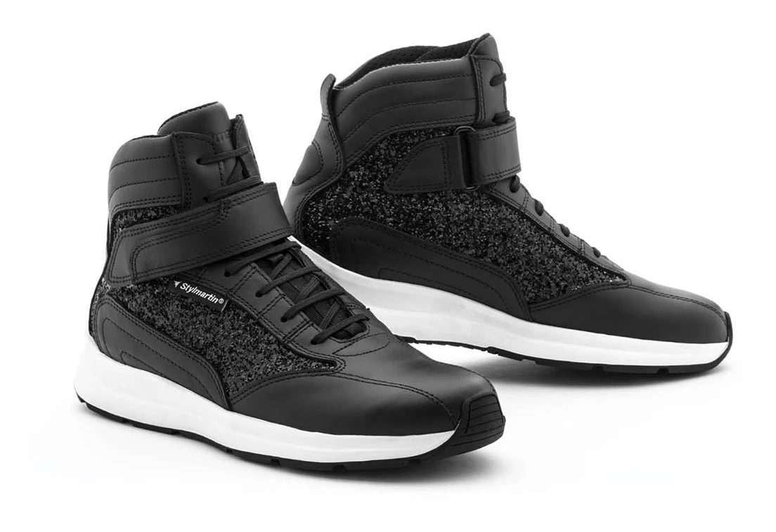 The Stylmartin Audax Riding Shoes are the high tops for the sneakerhead motorcyclist. A leather suede and fabric upper give the appearance of an old school high top, while waterproofing and and a stiff sole provide protection for the road. Two sets of laces let you configure your shoe as you prefer. Side panels are accented with glitter – adding an extra bit of attitude and even some low light visibility.ย