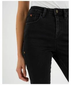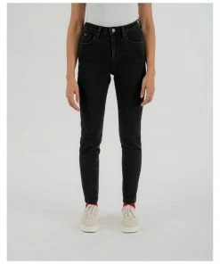 - Skinny fit in five pocket style with high waist and zipper